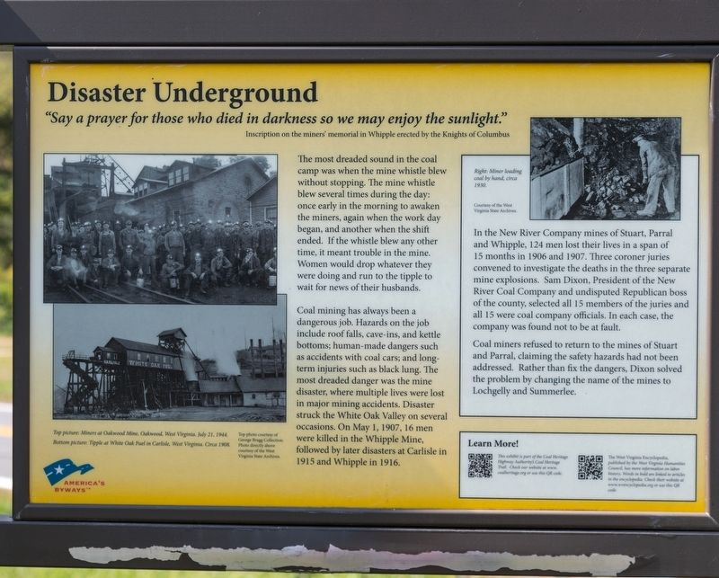 Location: 37° 57.506′ N, 81° 9.947′ W. Marker is in Whipple Junction, West Virginia, in Fayette County. It is at the intersection of Okey L Patterson Road (West Virginia Route 612) and Scarbro Road (Route 1/5), on the right on Okey L Patterson Road. It is across from the Whipple Company Store and Museum. Marker is at or near this postal address: 7485 Okey L Patteson Rd, Scarbro WV 25917. Photographed by J. J. Prats Source: Historic Marker Database